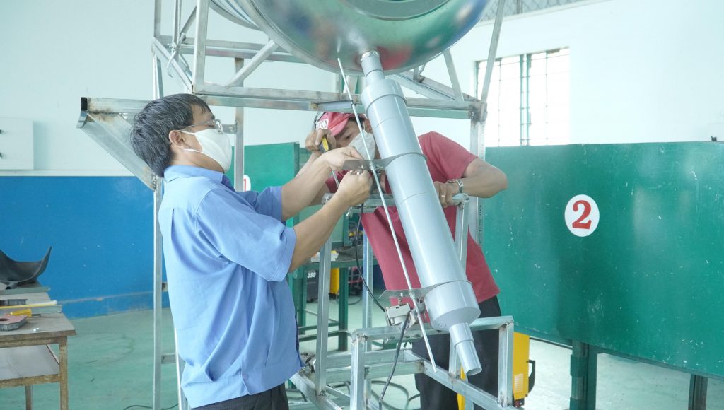 Theo ThS Bùi Mạnh Tuấn, Trưởng khoa Cơ khí: “Máy ATM gạo MITC có sự nâng cấp, cải tiến dựa trên công nghệ được chuyển giao, được thi công trong thời gian nhanh nhất và tận dụng mọi vật tư, thiết bị mà nhà trường và địa phương hiện có nhằm tạo ra sản phẩm tối ưu với chi phí phù hợp phục vụ tốt nhất cho việc cấp phát gạo miễn phí tới bà con”. Kết cấu máy gồm có bồn chứa gạo cao hơn 3m, hệ thống ống vận chuyển gạo, van tự động, hệ thống cảm biến và điều khiển, camera nhận dạng… Theo thiết kế chuyển giao ban đầu, việc vận chuyển gạo đưa lên bồn chứa theo phương thức thủ công thông qua việc gia công các bậc cầu thang để đưa gạo vào bồn chứa, phương pháp này mất khá nhiều công sức, vì vậy nhóm thực hiện đã trao đổi và bổ sung thiết kế chế tạo hệ thống gầu tải để cấp gạo vào bồn. Cải tiến này giúp việc cấp gạo được thực hiện nhanh chóng và liên tục, không mất nhiều công sức, đồng thời giúp cho kết cấu của máy được tinh gọn hơn. Gạo từ bồn chứa chạy theo đường ống xuống, có bộ điều khiển bằng van tự động lập trình đóng và mở đúng số lượng gạo được nhận. Nếu gạo trên bồn chứa dưới mức cạn, mạch điều khiển sẽ kích hoạt cầu tải gạo để tải gạo vào bồn chứa, khi đầy mạch điều khiển sẽ tắt cầu tải gạo. Hệ thống cảm biến liên kết với mạch điều khiển nhận dạng được người đứng trước và điều chỉnh quá trình đóng mở van phát gạo theo đúng yêu cầu. Toàn bộ quá trình hoạt động của hệ thống được kiểm soát và giám sát từ xa thông qua ứng dụng điện thoại.