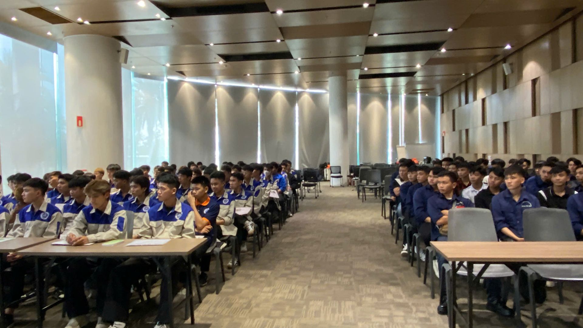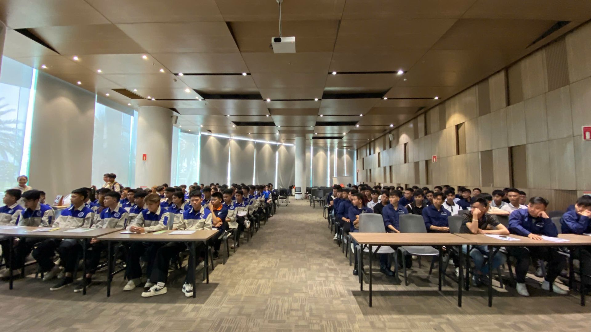Khi xe vừa tiến vào khu tổ hợp sản xuất VinFast tại Hải Phòng, các bạn sinh viên như “choáng ngợp”. Một không gian sản xuất rộng lớn, sạch sẽ, hiện đại bậc nhất với hàng loạt dây chuyền tự động hóa hoạt động không ngừng nghỉ. Đây không còn là những hình ảnh mơ hồ trong giáo trình – mà là một nhà máy thực sự, nơi sản sinh ra những mẫu xe mang thương hiệu Việt vươn tầm thế giới.